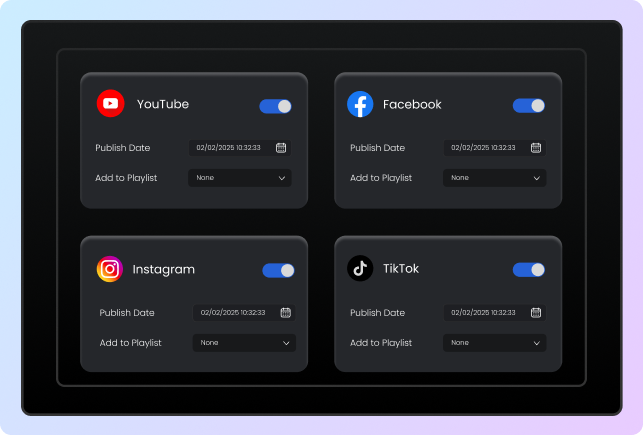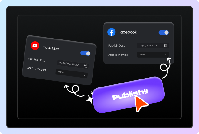 Publish your content directly to YouTube and Facebook in one click. Save time, increase consistency, and streamline your entire video distribution process.