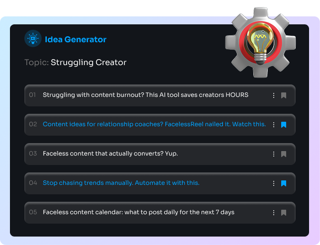Never run out of content ideas. FacelessReel suggests high-converting, trend-based video topics based on your niche—so you can create what the algorithm loves and your audience craves.